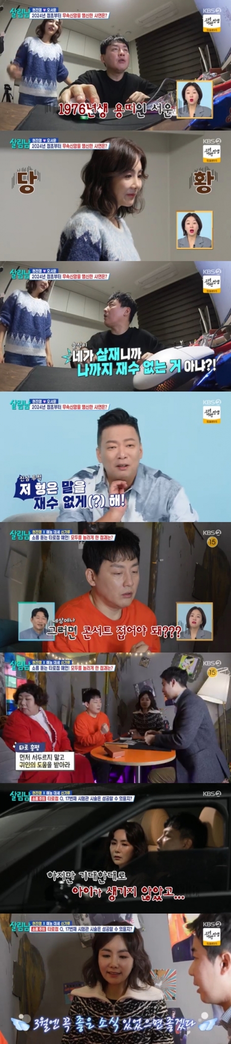 이후 현진영 아내 오서운이 '시험관 시술 결과'에 대해 궁금해 했다. 아이를 갖고 싶은 오서운의 마음이 다시 한번 드러난 것. 타로마스터는 오서운의 타로점 결과에 대해 "그래도 3월이. 일정 관련해서, 3월이 넘어가지 않게 하셨으면 좋겠어요. 3월 넘기지 않으셨으면 좋겠어요"라는 의견을 전했다. 이에 오서운은 "3월에 하려고 생각했었어요"라면서 시험관 시술에 좋은 결과가 있기를 바랐다.