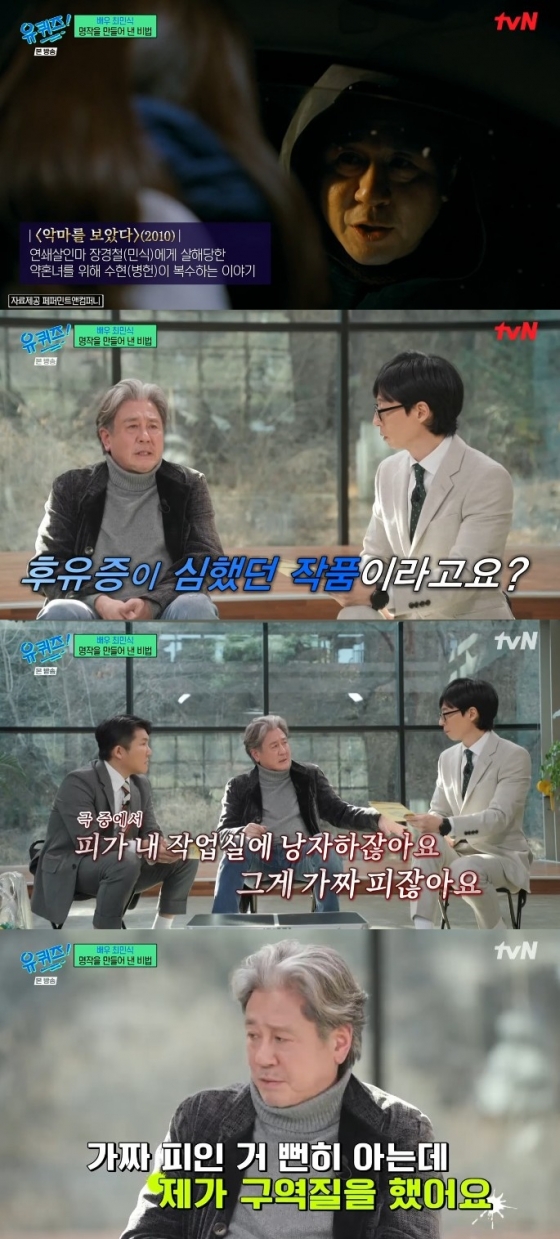 이어 최민식은 '악마를 보았다'가 후유증이 심했던 작품이라며 "그런 거에 배우들이 영향을 받는다. 극 중에서 피가 내 작업실에 낭자했다. 가짜 피지 않나. 물청소를 하는 장면에서 가짜 피인데도 구역질을 했다"고 설명했다. 그러면서 "그게 피비린내로 느껴져서 급히 촬영을 중단하고 오바이트를 하고 돌아왔던 적도 있다"고 덧붙였다.