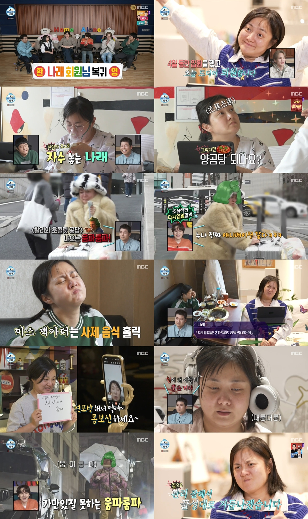 최근 '후두 미세수술'을 받은 박나래는 입원한 나흘 동안 프랑스 자수와 독서, 일러스트 등 취미 생활을 하며 지루함을 견뎌냈다. '나래 A.I.'가 박나래의 목소리를 대신하는 상황은 웃음을 자아냈다. 박나래는 간호사에게 주의 사항을 들은 후 몸집만 한 캐리어를 끌고 퇴원했다. 털모자와 털옷으로 중무장한 박나래의 '퇴원룩'이 시선을 강탈했다.