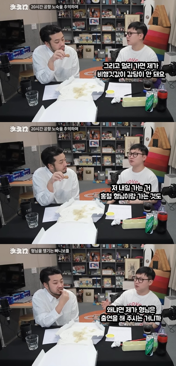 이어 빠니보틀은 "멀리 가면, 제가 비행깃값이 감당이 안 돼요"라고 했다. 또 "저 내일 가는 거, 홍철 형님이랑 가는 것도"라면서 밝혔다.