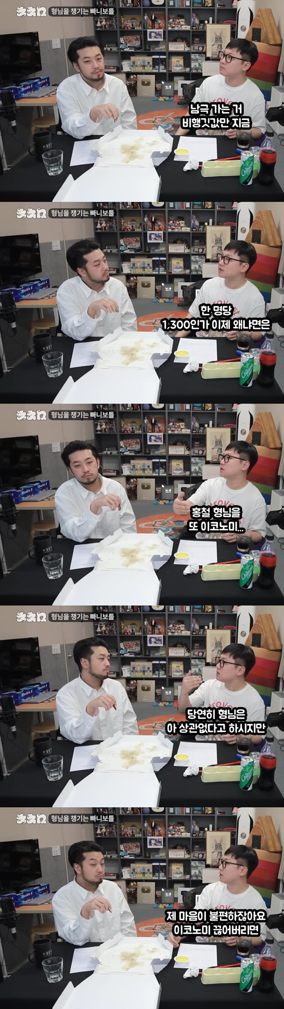 빠니보틀은 "남극 가는 거 비행깃값만 지금, 한 명당 1300(만원)인가"이라고 밝혔다. 이와 함께 "이제, 왜냐면 홍철 형님을 또 이코노미. 당연히 형님은 상관없다고 하시지만 제 마음이 불편하잖아요, 이코노미 끊어버리면"이라고 언급했다.