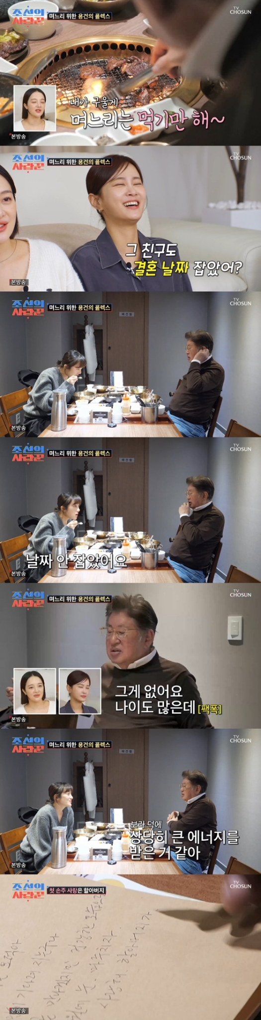 또한 이날 김용건은 손주를 향한 애정을 담은 손편지까지 남겼다. 그는 편지에 "사랑해. 할아버지가"라는 글도 남겼다. 이에 황보라는 크게 기뻐했고, 김용건은 며느리 덕분에 큰 에너지를 받은 것 같다면서 며느리 칭찬에 나섰다.
