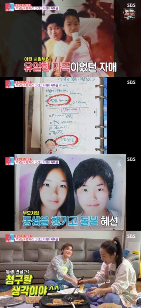 그러면서 "안 해본 일 없이 대학 포기 후 공장 취업했었지 않나. 너 대학 간다고 대출도 받고"라고 덧붙였다. 이에 동생 세라는 "기억을 못할 수가 없다. 세월이 지나 언니의 옛날 다이어리를 본적이 있다. 달마다 '세라 용돈' 무조건 쓰여 있고 심지어 내 휴대폰 비용까지 내줬다"며 김혜선에 고마운 마음을 전했다.