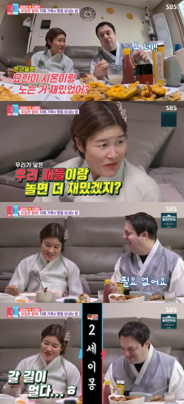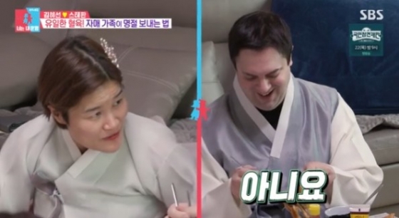 이날 김혜선은 여동생 가족들과 명절 음식을 먹으며 도란도란 이야기를 나눴다. 김혜선은 식사를 하던 중 "오늘 조카 요한이, 시온이랑 노는 거 재밌었냐"며 스테판에 물었다.