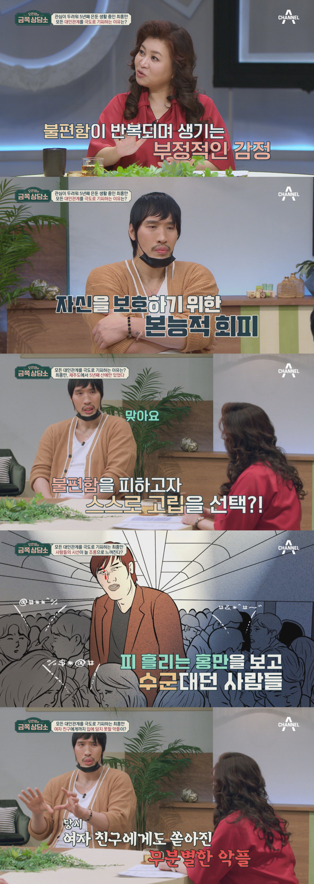 이에 공감한 최홍만은 과도하게 긴장하면 무슨 일이 일어났는지 기억나지 않을 때도 있다고 고백한다. 한번은 대중교통을 이용 하려다가 많은 사람들이 모인 것을 보고 긴장한 나머지, 지하철 문에 머리를 박아 피를 흘리기도 했다고 털어놓는다. 이를 들은 오은영 박사는 이럴 때 의지할 수 있는 사람이 가족인데, 가족에게 의지하지는 않았는지 질문한다. 이에 최홍만은 어린 나이에 타지에서 운동했기 때문에 가족에게도 의지할 수 없었다고 설명하며 눈에 띄는 외모 때문에 가족 여행도 가기 힘들었다고 대답해 안타까움을 자아낸다.