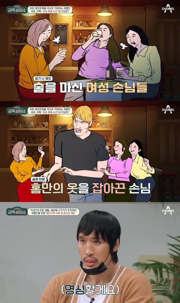 이날 방송에서 최홍만은 20대 여성을 폭행했다는 루머에 대해 입을 열었다. 그는 "당시 주점을 운영했을 때다. 이성 간 합석이 가능한 술집이었다"며 당시를 회상했다.