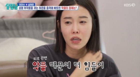 심하은은 제작진과의 인터뷰에서 "지인과 즐겁게 밥을 먹고 있는 사진을 보고 어떤 사람이 '성형했는데도 영'이라고 메시지를 보낸 적 있다. 너무 기분 나빴다. 잘 모르시는 분들이 지나친 외모 비하를 하신다. 생각만 해도 화가 난다"고 속상함을 토로했다.
