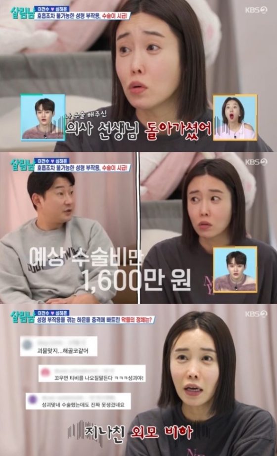 이에 심하은은 "수술이 쉽게 하는 게 아니다"며 "예상 수술비만 1600만원이었다. 쌍둥이 육아 문제에 오빠는 늘 바빴다. 재건 수술도 아버님이랑 같이 갔다"고 이천수에 서운함을 토로했다. 또 "이런 부작용만 해도 너무 힘든데 외모 관련 악플 때문에 더 힘들다"고 덧붙였다.