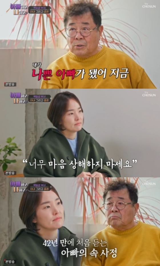 백일섭은 백지은에 "방송 보니까 내가 나쁜 아빠가 됐다"며 조심스럽게 이야기를 이어갔다. 이어 "그래서 오늘은 내가 겪어왔던 일들을 설명해서 너한테 덜 나쁜 아빠가 되고 싶다"고 설명했다.