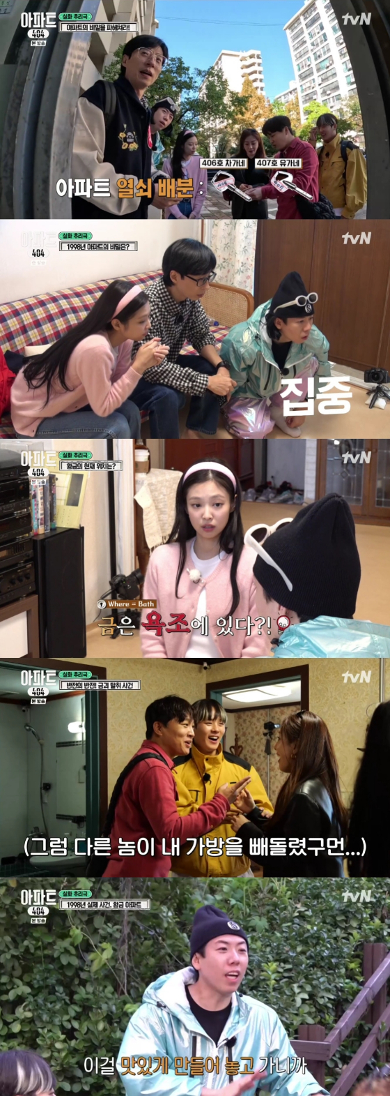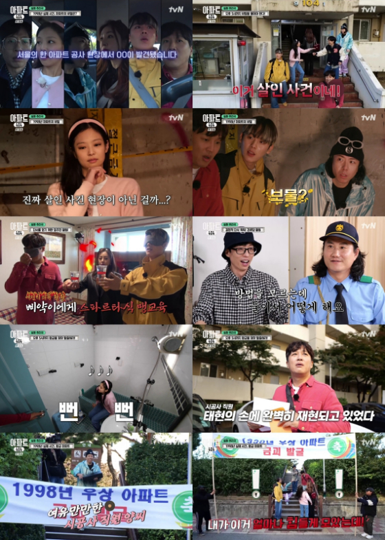 지난 23일 방송된 tvN '아파트404'(연출 정철민, 신소영)에서는 첫 번째 에피소드 '파묻혀 있던 진실'이 공개됐다. 유재석, 차태현, 오나라, 양세찬, 제니, 이정하는 1998년 우상 아파트를 누비며 추억 소환은 물론 추리하는 재미, 다이내믹한 게임, 찰떡 케미스트리로 웃음을 선사했다. 특히 예측 불가 반전의 연속으로 허를 찌르며 흥미를 고조시켰다.