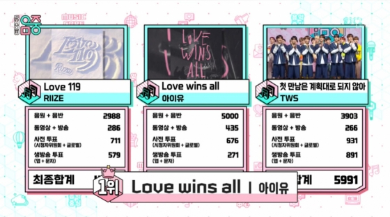1위 후보로는 라이즈의 '러브 119(Love 119)', 아이유의 '러브 윈즈 올(Love wins all)' 그리고 투어스의 '첫 만남은 계획대로 되지 않아'가 올랐다. 치열한 접전 끝, 아이유가 1위를 차지했다. 아이유 뒤로 2위는 투어스, 3위는 라이즈가 이름을 올렸다.