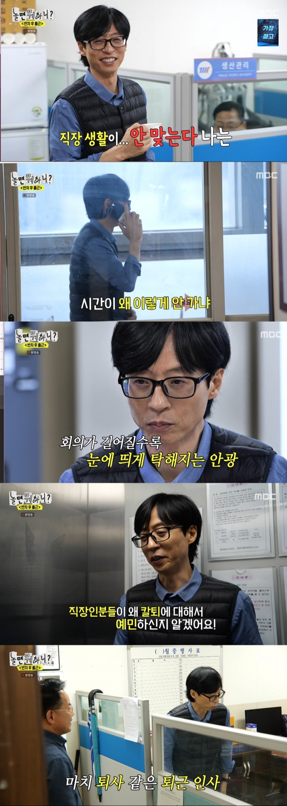 '놀면 뭐하니' 유재석이 근무 중 칼퇴를 간절히 소망했다.