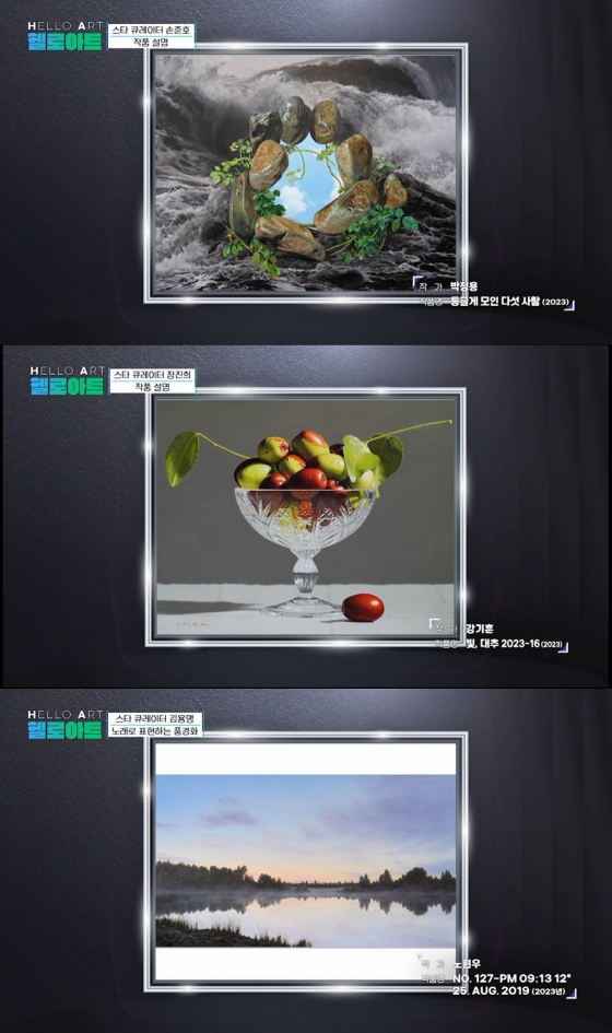 지난 24일 방송된 '헬로아트' 5회에서는 사진과 구분되지 않는 '극사실회화'를 다뤘다. 돌 그림 전문가인 박정용 작가 외에 대추 그림을 테마로 하는 강기훈 작가와 극사실주의 풍경화를 그리는 노현우 작가의 작품을 배우 장진희와 개그맨 김용명이 '스타 큐레이터'로 나서 소개했다.