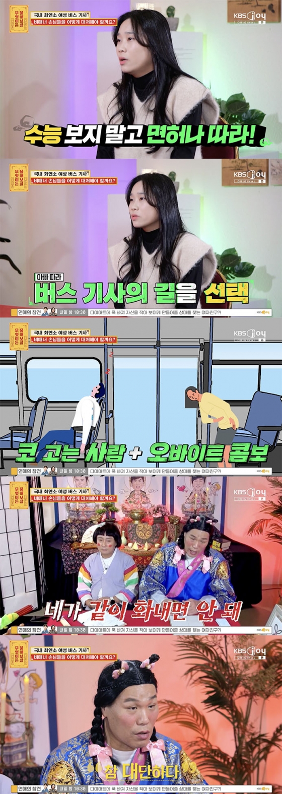 26일 방송된 KBS Joy '무엇이든 물어보살'에서는 27세의 국내 최연소 여성 버스 기사 김혜원 씨가 출연해 고민을 토로하는 장면이 그려졌다.