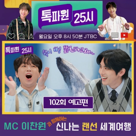 첫 번째 랜선 여행은 멕시코의 '로스카보스'. 현지 톡파원이 보트를 타고 달려서 만난 혹등고래가 수면 위로 힘차게 뛰어오르는 웅장한 모습을 본 이찬원은 "오~"라며 천진난만한 모습으로 웃으며 손뼉 치는 모습을 보여 유쾌함을 안겼다.