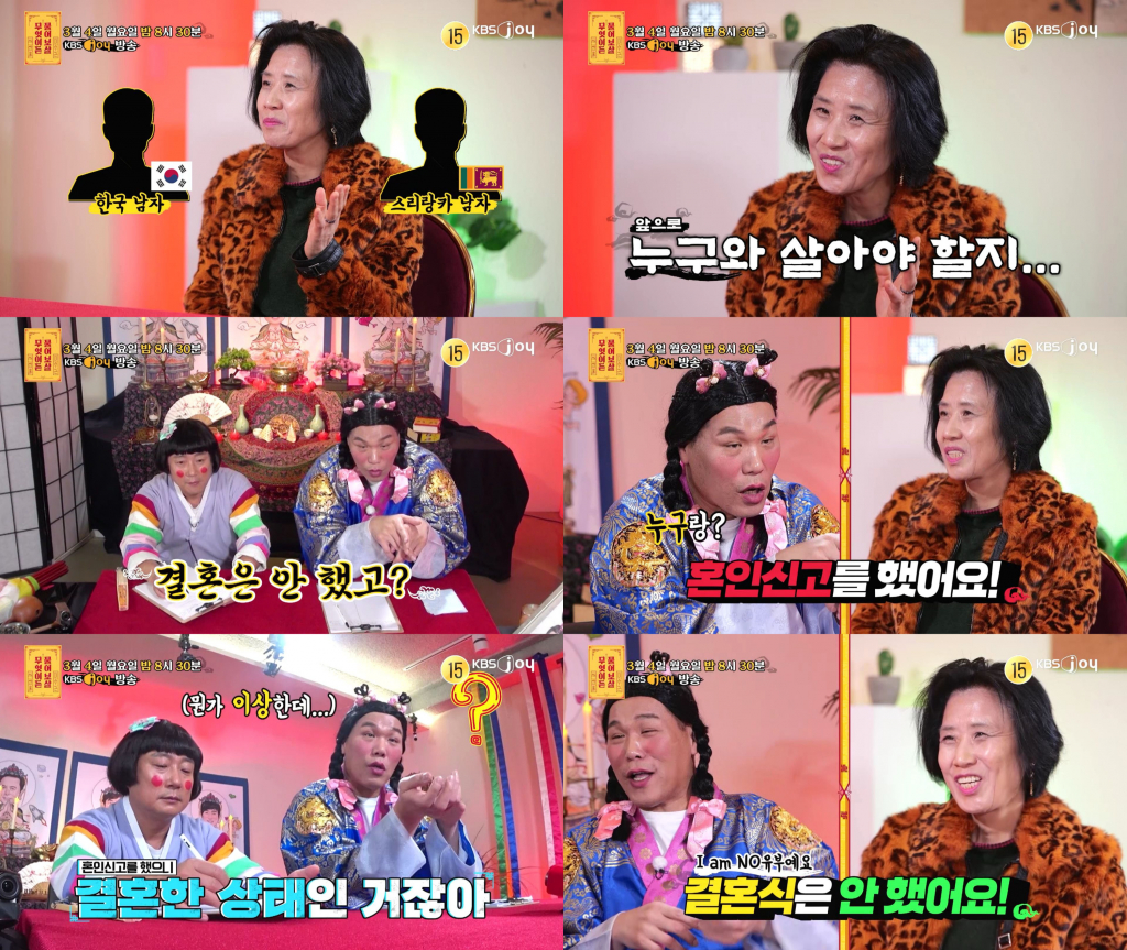 호피 무늬 코트를 입고 나타나 "이상민 가족인가 생각할 정도 닮았다"라며 서장훈의 눈길을 사로잡은 55세 사연자는 한쪽은 스리랑카 남자, 한쪽은 한국 남자인데 어느 쪽 남자와 살아야 할지 고민이라고 털어놨고, 현재 싱글인지 묻는 서장훈에게 "혼인신고는 돼 있고, 애 아빠랑은 결혼을 한 번 했다"라고 이해하기 어려운 답변을 내놔 보살들을 알쏭달쏭하게 했다.