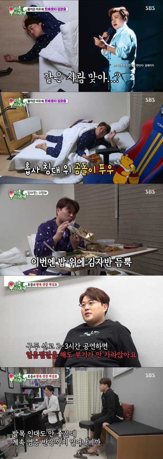 '트바로티' 김호중이 4년 만에 '미운 남의 새끼'로 돌아왔다. 눈을 뜨자마자 침대에 누운채 게임과 노래 연습을 하며 보는 母벤져스를 답답하게 하던 김호중은 매일 아침 루틴대로 몸무게를 체크하기 위해 기상 후 처음으로 침대 밖을 벗어났다. 상의까지 벗으며 진지하게 체중을 쟀지만 92kg라는 충격적인 결과에 좌절하던 것도 잠시, 김호중은 충격을 잊고 바로 배달시킨 갈치 정식을 무한 흡입하는 천진난만한 모습을 보였다.