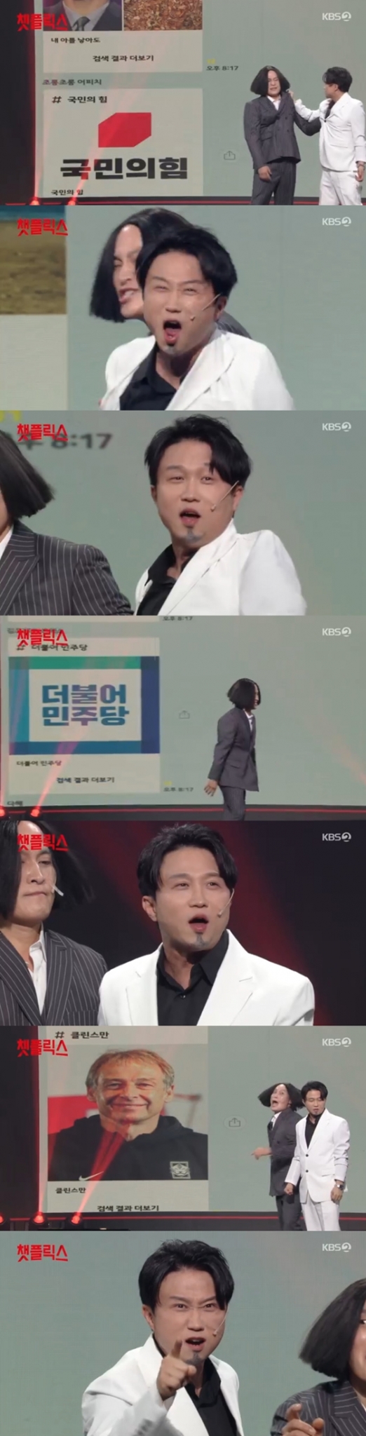 이후 송준근이 박성광에게 복수를 해달라고 부탁했다. 박성광은 "상대가 누군가!"라고 했고, 이때 클린스만 전 한국 국가대표 축구팀 감독의 얼굴이 채팅창에 등장했다. 박성광은 "이거 예상도 못했어. 너무 부담스러워"라고 외치면서 당황한 기색을 보였다. 앞서 정치 언급에 이어 또 한번 어쩔 줄 몰라했다.