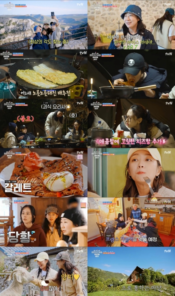 다음 목적지는 남프랑스의 시골 정취 가득한 '몽 에귀'였다. 가는 길에 발랑솔 라벤더밭에 들른 멤버들은 그림 같은 보랏빛 물결을 기대했지만, 아쉽게도 개화 시기가 아니었다. 4인방의 시선을 붙든 곳은 또 있었다. 거대 암벽 위 성채가 자리한 매력적인 소도시 시스테롱. 4인방은 근처에 들러 점심 메뉴로 크레페를 맛보기로 했다. 한가인은 지나가던 아이를 귀여워했고, 라미란은 "하나 더 낳아"라고 제안했다. 이에 한가인은 "너무 무섭다. 공포 영화다. 셋째는 사랑이라던데 상상해 본 적도 없다. 처음 낳았을 때는 아이를 키울 줄 모르니까 아이가 울면 나도 같이 울었다. 조리원에 나와서 일주일 됐는데 아이가 잠도 안 자고 계속 울더라. 남편하고 응급실을 갔더니 너무 멀쩡했다. 가서 자더라"라고 일화를 전했다.