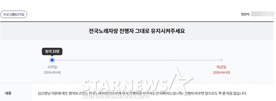 해당 청원 글에는 "김신영님 덕분에 매주 챙겨보고 있는 '전국노래자랑'인데 이제 와서 진행자를 바꾸자는건 어쩌자는겁니까?"라면서 "진행자 바꾸면 앞으로도 쭉 볼 마음 없습니다"는 내용이 담겼다. 이 청원에 4일 오후 3시 44분기준 33명이 동의했다.