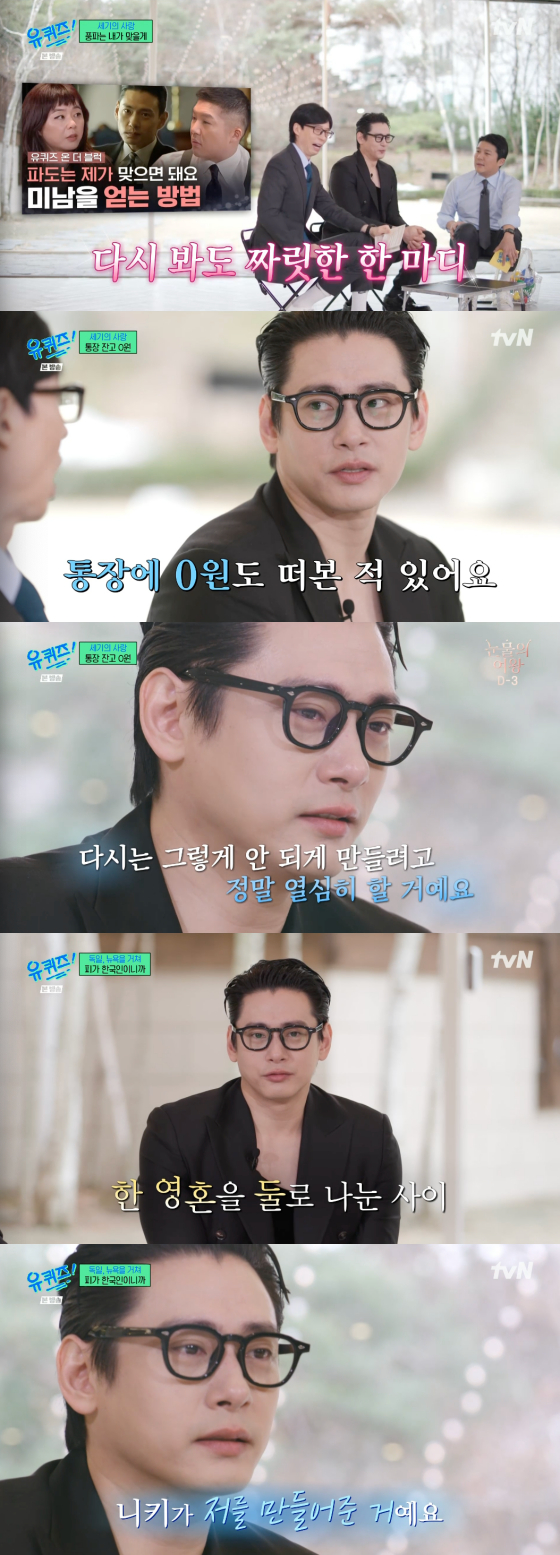 유태오는 무명 시절 "통장에 0원이 찍힌 적도 있었다"며 "니키의 작업으로 잘 메꿀 수는 있었지만 너무 미안했다"고 토로했다. 이어 "한참 돈 못 벌었을 때는 신발도 고르다 내려놨다. 2만 원이 아까워서. 다시는 그렇게 안 되게 열심히 할 거다"며 울컥했다.