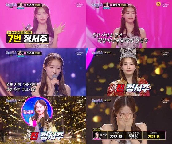 완벽한 무대를 선보인 정서주는 1485점으로 마스터 총점 1위를 차지했다. 온라인 점수, 실시간 문자 투표까지 합친 결과, 정서주는 최종 점수 2823.18점으로 '미스트롯' 3대 진(眞)이 됐다. 이에 따라 정서주는 상금 3억원도 차지하게 됐다.