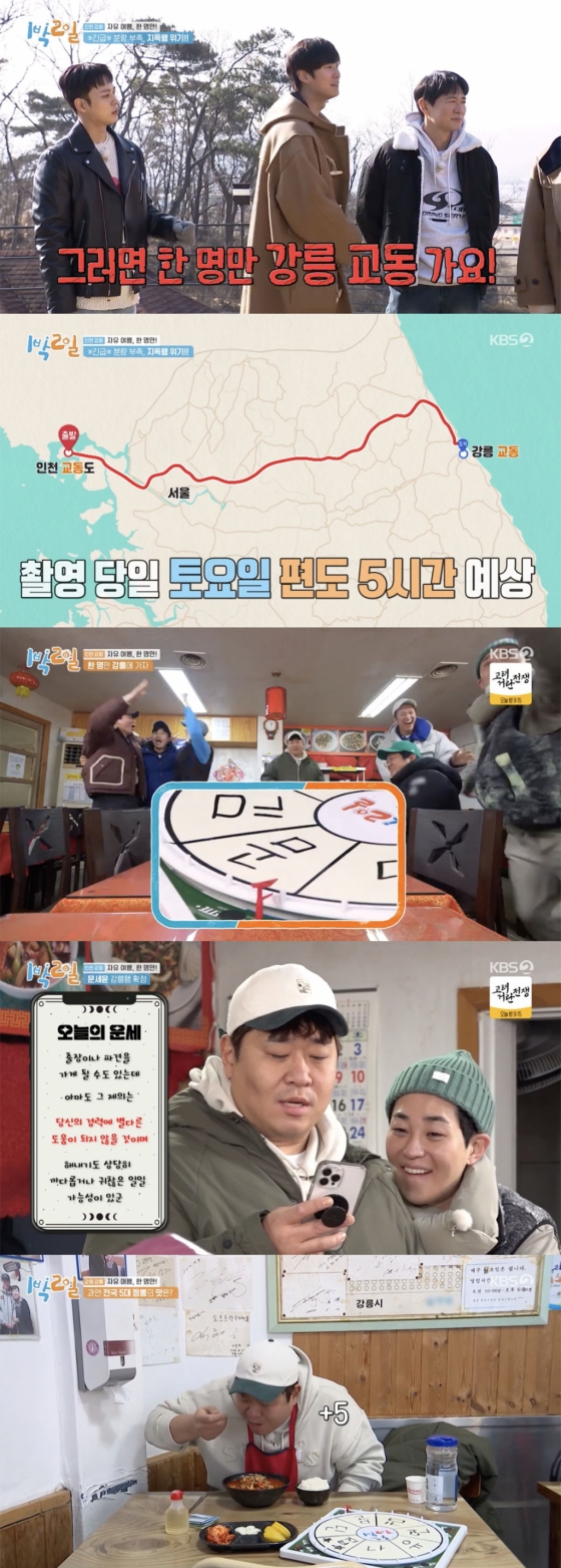 전날 오프닝에서 김종민은 "'교동 짬뽕'의 교동이 강화도의 교동도가 아니다. 강릉이다"라고 한 바 있다. 이를 들은 나인우는 "한 명만 강릉 교동 가요"라고 제안했었고, 딘딘은 이를 받아들여 마지막 점심 미션에서 룰렛을 돌려 걸린 단 한 사람이 강화도 교동 짬뽕이 아닌 강릉 교동 짬뽕을 먹자고 한 것.