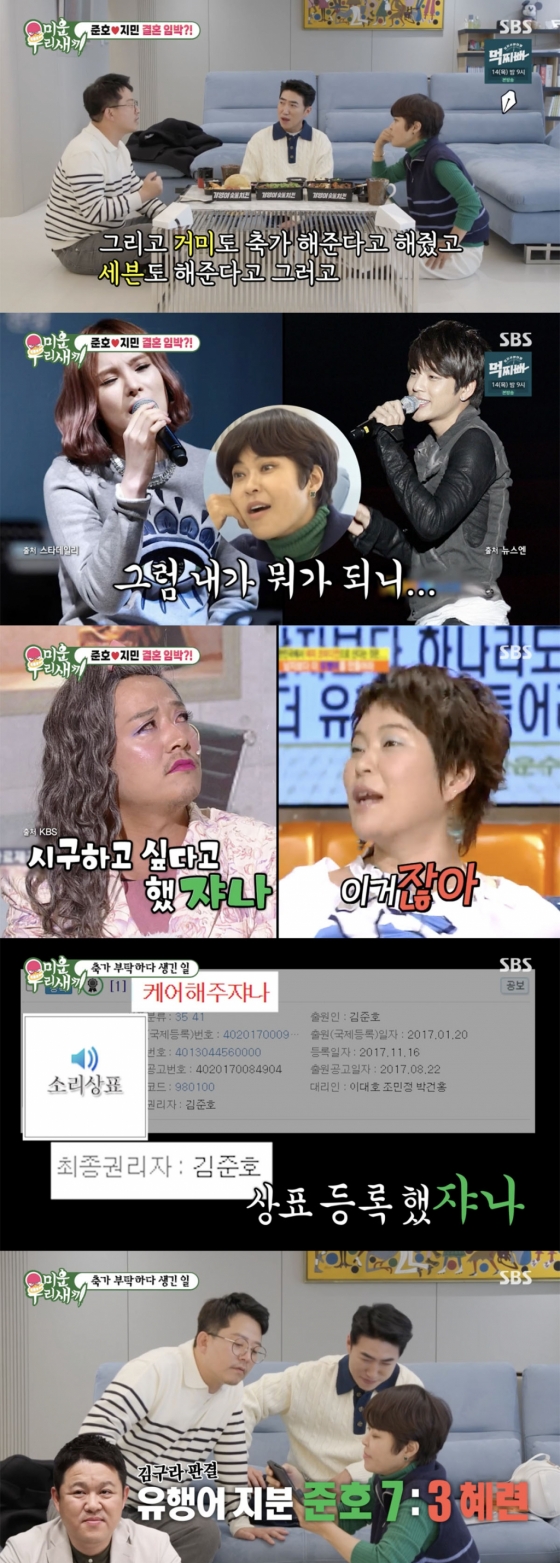 김준호는 법적 자료가 중요하다며 '케어해주잖아'를 소리 상표로 등록했던 것을 증거로 보였다. 이에 조혜련은 과거 김준호가 방송에 출연해 직접 '~쟈나'의 유행어는 조혜련 선배의 '~잖아'를 참고해 만들었다고 발언했던 것을 증거로 내보였다.