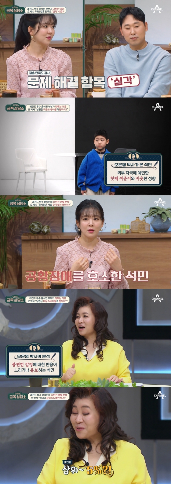 이날 오은영은 미리 시행한 부부의 결혼만족도 검사 결과, '문제 해결 항목'에서 '심각'지표가 나타났다고 했다. 그러면서 남편 윤석민이 첫째 아들과 비슷한 '외부 자극에 예민한' 성향을 갖고 있다고 설명했다. "바로 반응하면 될 것도 바로 반응하지 않는다. 어색하고 불편한 상황에 대해 반응해야 하는데 그 반응이 느리거나 유보한다"라고 윤석민의 성향에 대해 설명했다.
