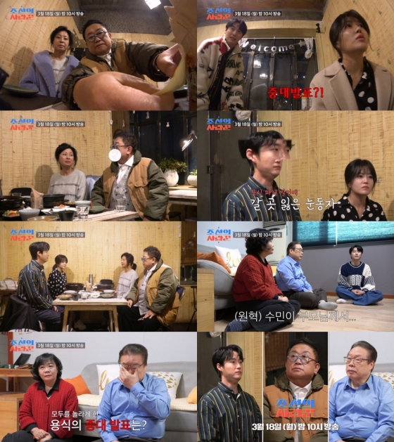 제작진과 이야기를 나눈 뒤 잔뜩 굳은 표정으로 이수민♥원혁과의 저녁 자리에 나간 이용식은 '손주, 파주, 건강'이라고 적힌 메모를 식사 직전까지 들여다봤다. 그리고 마침내 '중대발표'의 실체를 접한 원혁은 침만 꿀꺽 삼킬 뿐 제대로 말을 잇지 못했다. 원혁의 부모님 또한 이 소식에 심각한 표정을 숨기지 못한 가운데, 이용식의 '중대발표' 내용은 본 방송에서 공개된다.