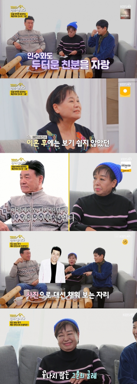 이날 박원숙은 혜은이의 전 남편인 배우 김동현과 한인수가 절친이었던 것을 언급하며 "우리 직업이 이래서 참 좋다. 김동현 씨, 한인수 씨 그리고 혜은이랑 셋이서 엄청 친하지 않았냐. 이혼 후 만나기 쉽지 않았는데 이렇게 동료로 만나니까 좋다"라고 했다.