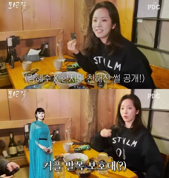 이날 영상에서 한지민은 김혜수와 인연에 대해 털어놓기도 했다. 그는 "(한)지민 씨한테도 연예인이 있냐"는 박혜령 PD의 질문에 "있다. 김혜수"라며 "근데 가까이에서 본 선배님은 그럼에도 연예인 같다"고 말했다. 한지민은 김혜수에 대해 "너무 천진난만하고, 귀여우시고 소녀 같으시고 이런 모습 너무 좋은데 그래도 너무 어릴 때 봤던 (연예인이다)"고 전했다.