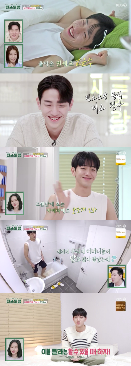 이어진 영상에서 남윤수는 눈을 뜨자마자 해맑게 미소지어 여심을 설레게 했다. 또 몇 개월만에 쉬는 날이라면서 바로 이불 빨래를 해 놀라움을 자아냈다. 세탁기도 아니고 직접 욕조에서 발로 밟아 빨래를 하는 모습에 이연복은 "요즘 누가 저렇게 빨래 하냐"고 깜짝 놀랐다.