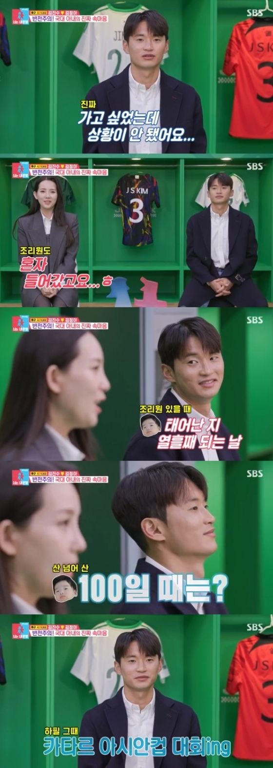 김진수는 "출산 때도 가고 싶어서 열심히 노력했는데 그게 잘 되지 않았다. 100일 때는 카타르에 있었다. 아내가 고생을 많이 한다. 미안하게 생각한다"고 사과했다.