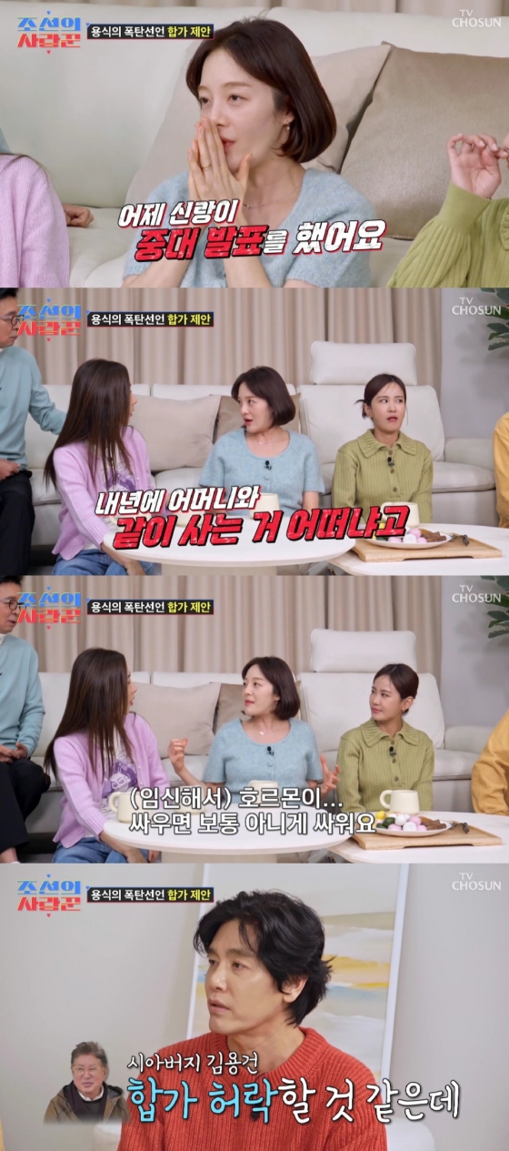 그러면서 "합가는 우리 시댁에도 물어봐야 한다"고 조심스러운 모습을 보였고, 최성국은 "김용건 선배님은 합가 허락하실 것 같다"고 덧붙였다.