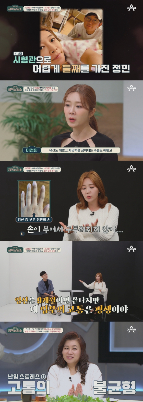 이날 이정민은 남편 박치열이 평소 감정 표현을 하지 않아 서운한 적이 많았다고 고백한다. 특히 가장 서운했던 일로 시험관 시술을 통해 둘째를 임신했을 때를 언급하는데. 당시 이정민은 남편 박치열에게 힘든 마음을 털어놓았지만 "너의 임신은 9개월이면 끝나지만, 나의 업무 고통은 계속해서 심해질 거야"라는 차가운 대답을 들었다고 고백한다. 이어 이정민은 남편이 수술이 잦은 의사이기에 손 통증이 있다는 것은 이해하지만, 자신의 고통만 강조하는 남편에게 상처를 받았었다고 고백한다. 이에 박치열은 아내가 서운해한다는 것은 알고 있었지만, 직업이 의사이기 때문에 냉정하게 판단하려고 했던 것 같다고 설명한다.