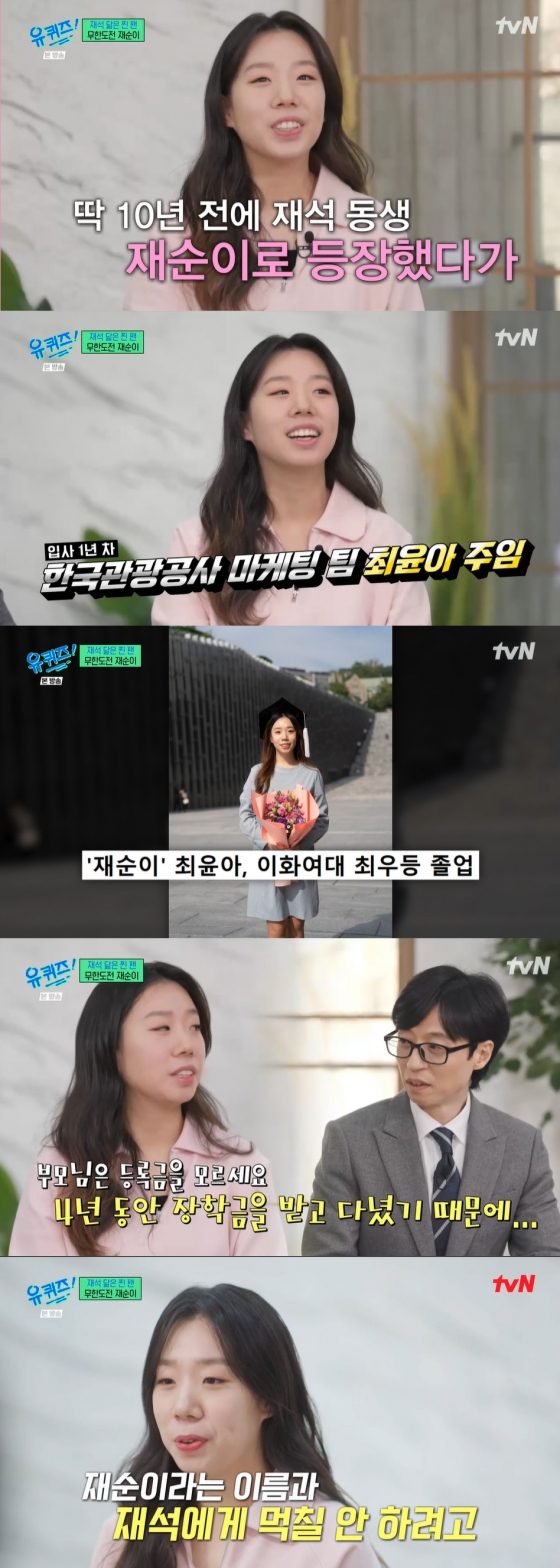 '유 퀴즈 온 더 블럭'에 '유재석 동생 재순이' 최윤아 씨가 우수한 학업 성적을 공개했다.