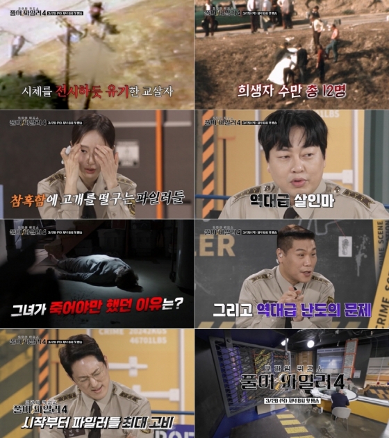 이 가운데 공개된 '풀어파일러4' 1화 예고 영상은 첫 사건부터 경악스러운 범죄 사례를 조명해 시선을 강탈한다. 무려 12명을 교살하고 시체를 전시하듯이 유기한 '희대의 관종 살인마'의 범죄행각에 박선영은 "아 너무 싫다"라며 몸서리를 치고, 이진호는 참혹한 사건에 차마 말을 잇지 못하는 모습. 이에 12구의 시신을 전시한 역대급 연쇄 살인마의 정체와 사건의 전말에 궁금증이 폭등한다. 뒤이어 음습한 창고 안에서 수갑을 찬 채 싸늘한 시신으로 발견된 할머니의 미스터리한 사망 사건까지 조명돼 호기심을 한껏 자극한다.