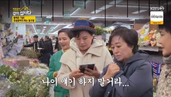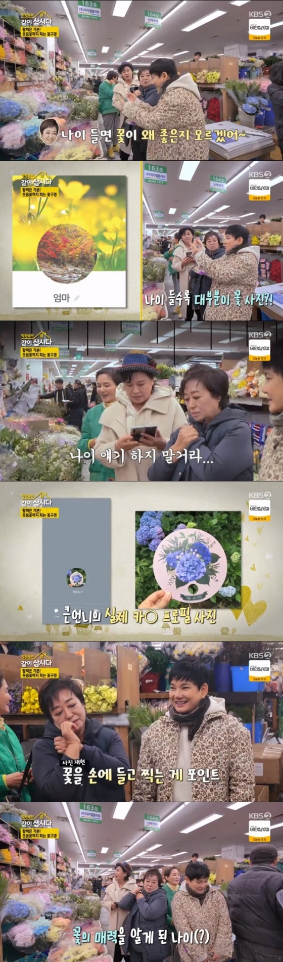 꽃시장을 둘러보며 봄꽃의 매력에 푹 빠진 혜은이는 "나이가 들면 왜 꽃이 좋아지는지 모르겠다"고 말했다. 이에 안문숙은 "카카오톡 프로필에 꽃 사진을 올려둔 사람을 보면 대부분 나이 든 엄마다"리고 말해 모두의 공감을 얻음과 동시에 웃음을 유발했다.