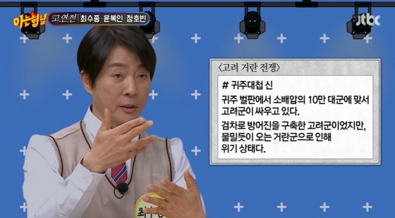 23일 오후 방송된 JTBC '아는 형님'에서는 KBS 2TV 대하 사극 '고려거란전쟁'을 이끈 최수종, 윤복인, 정호빈이 게스트로 출연했다.