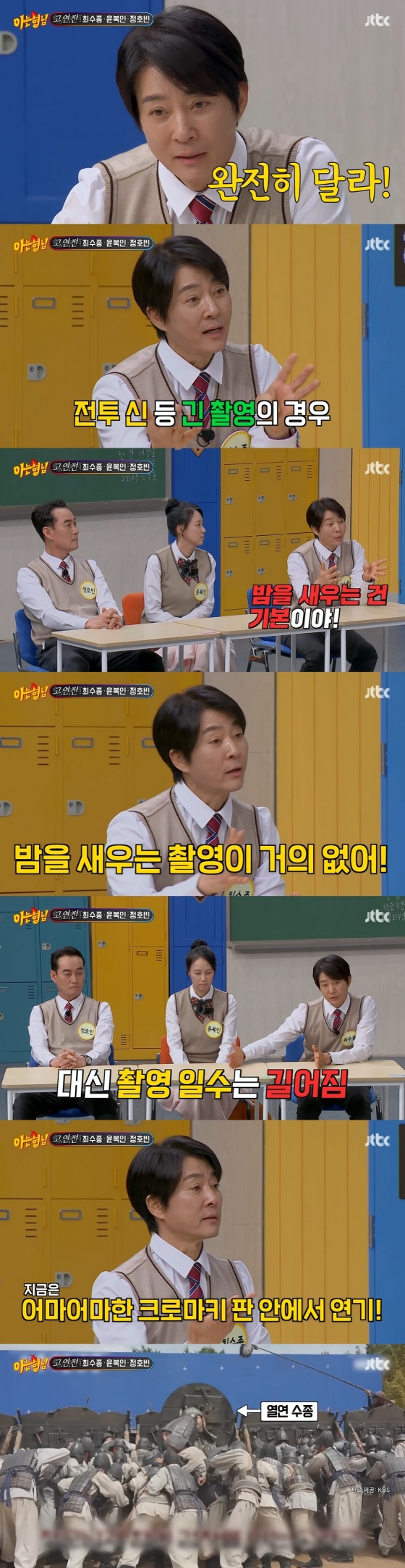또한 최수종은 사극 촬영 기법도 달라졌다면서 귀주대첩 신 촬영 비화도 털어놨다. 그는 "예전에는 앞에 사람들이 실제 인물인 상태로 연기를 했다. 지금은 어마어마한 크로마키 판 안에서 연기를 한다. 상상을 다 해야 한다. 뒤에서 마이크로 '화살이 오른쪽에서 한 번, 왼쪽에서 두 번 날아옵니다'라고 하면 그거에 맞춰 연기를 해야 한다"라고 이야기했다.