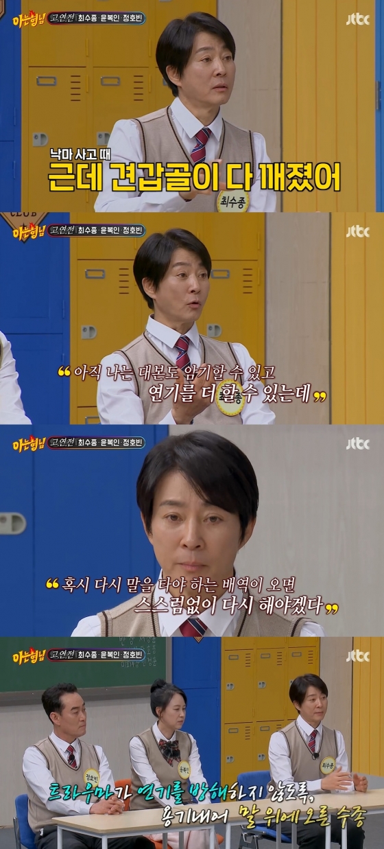 이날 민경훈은 과거 최수종의 낙마 사고를 언급, "트라우마는 없었냐"라고 물었다. 앞서 최수종은 지난 2012년 KBS 대하드라마 '대왕의 꿈' 촬영 중 낙마 사고를 당해 대수술을 받았다.