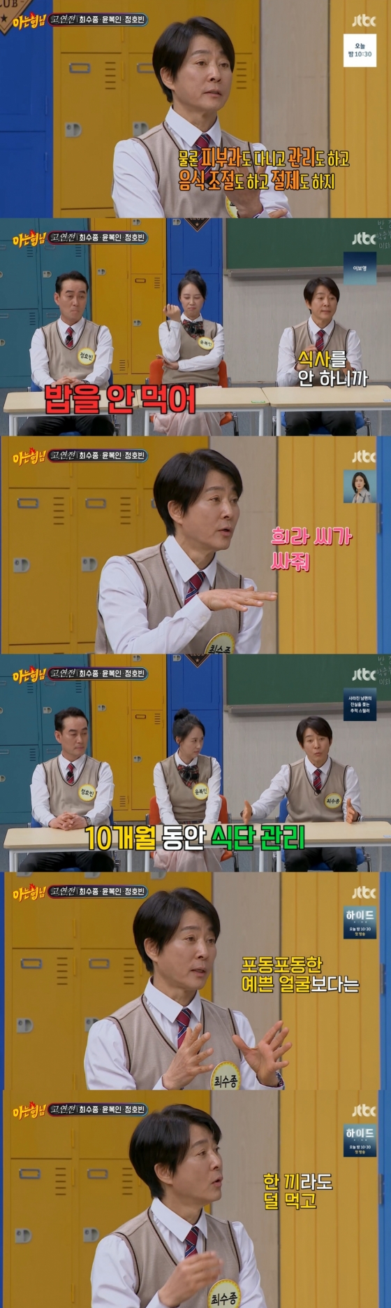 최수종은 "피부과도 다니고 관리도 하고 음식 조절도 하고 절제도 한다"면서 "이번 드라마를 하면서 후배들한테 미안한 거는 한 번도 같이 밥을 먹은 적이 없다. 식사를 안 한다. 늘 고구마, 삶은 달걀을 아내 하희라 씨가 싸준다. 그걸로만 다 먹는다. 밖에 안 나간다. 차에서만 먹고 10개월 동안 식사를 안 하고 식단 관리했다"라고 고백했다.
