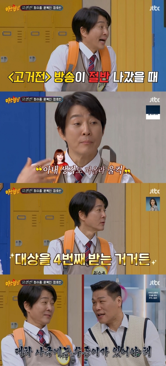최수종은 "사실은 대상을 받은 시기가 '고려 거란 전쟁' 방송이 절반 나갔을 때다. 방송이 채 다 되지도 않아서 대상을 줄리가 없다고 생각했기 때문에 진짜 깜짝 놀랐다. 설마 했다. 갑자기 모든 시간들이 다 떠오르고 하희라 얼굴도 떠올라서 감사할 일들이 너무 많아서 눈물이 나더라. 대상을 네 번째 받는 거다. 그러니까 얼마나 감사하냐"라며 당시를 추억했다.