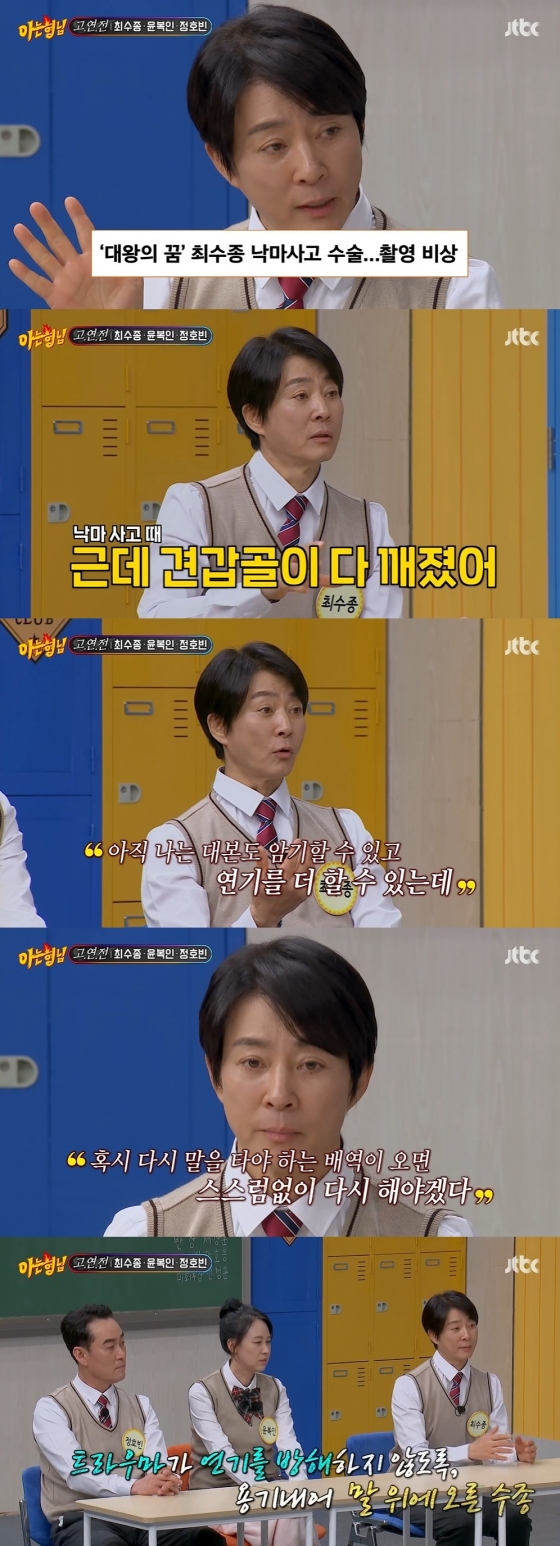 최수종은 낙마 사고를 당했던 과거도 떠올렸다. 그는 지난 2012년 KBS 대하드라마 '대왕의 꿈' 촬영 중 낙마 사고를 당해 대수술을 받았다. 이와 관련해 최수종은 "그때는 정말 큰 사고였다"면서 "인간이 교통사고가 나도, 차하고 부딪혀도 부러지지 않는 게 양날개 견갑골이다. 근데 견갑골이 다 깨졌다. 말에서 떨어져서 굴렀다. 어깨뼈부터 견갑골이 다 부러졌는데도 불구하고 진통제를 맞으며 드라마를 끝냈다"라고 밝혔다.