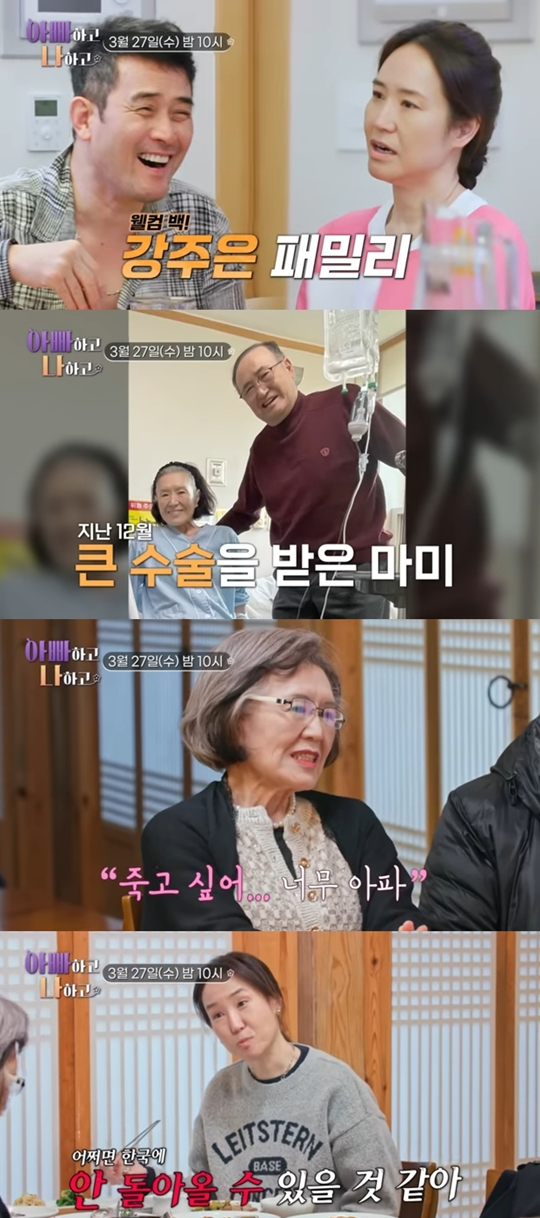 최근 녹화에서 강주은의 아버지는 "'아빠하고 나하고' 출연 도중 아내의 병으로 인해 하차하게 되어 죄송하다"며 지난해 12월 있었던 강주은 어머니의 수술 사실을 밝혔다. 이에 강주은은 "수술 직후 '엄마, 엄마'하고 불렀더니, 엄마가 고개를 저으며 '주은아 죽고 싶어. 너무 아파'라고 하더라"라며 눈물겨운 그날의 이야기를 전했다. 강주은 어머니는 "너랑 (최)민수가 매일 울면서 기도한 걸 안다"며 가족 모두가 가슴 졸였던 지난 시간을 회상했다.
