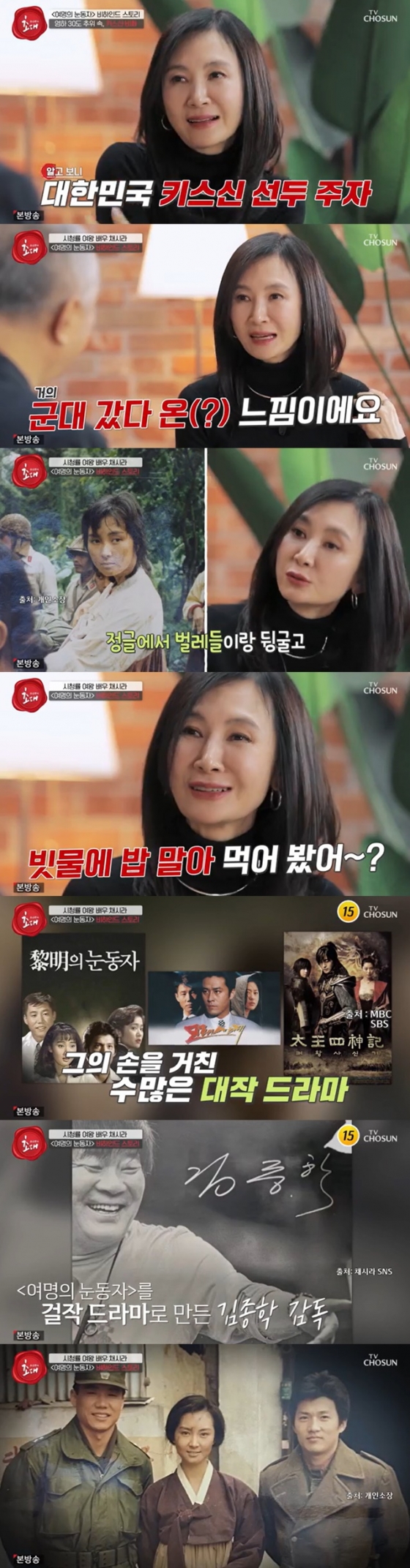채시라는 '여명의 눈동자' 촬영현장을 떠올리며 "거의 군대 갔다 온 느낌이었다. 정글에서 벌레들이랑 같이 뒹굴었고 빗물에 밥을 먹기도 했다. 22살밖에 안 됐을 때 찍었는데 소설책 10권을 다 보고 감독님이 길잡이도 많이 해주셨다"고 했다. '여명의 눈동자'는 '모래시계', '태왕사신기'를 연출한 김종학 감독의 연출작이었다.