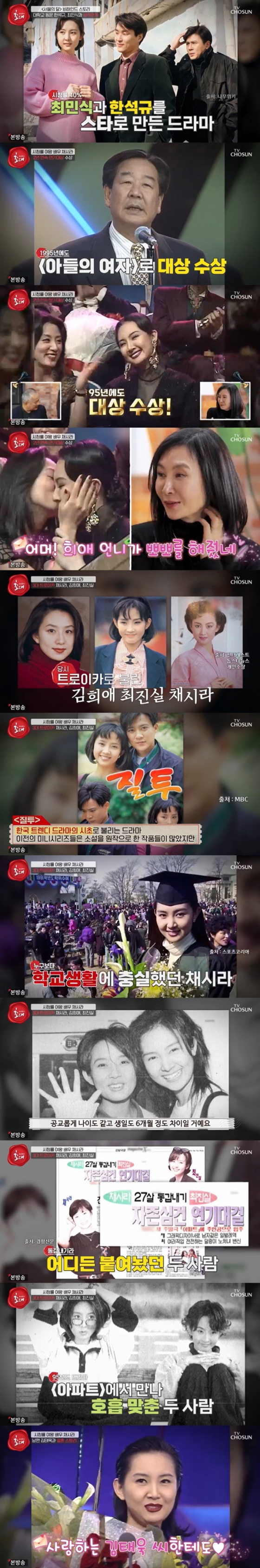채시라는 1995년 김희애와 경쟁해 대상을 수상한 적이 있다. 송승환은 "90년대에 세 명의 트로이카가 있었다. 채시라, 김희애, 최진실"이라며 "'질투'가 채시라에게 먼저 제안이 갔다고"라고 물었다. 이에 채시라는 맞다며 "대학원 공부를 하고 싶었다. 학교생활을 더 즐기고 싶었다. 왜 거절했나 모르겠다. 했어야 했다"라며 웃었다.