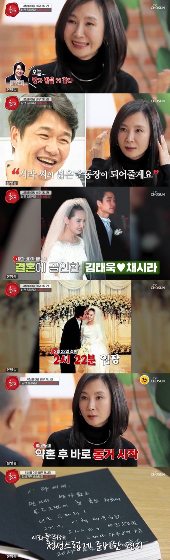 채시라는 "'왕과 비 '방송 끝나고 바로 다음날에 결혼했다. 그날이 좋은 날이라고 해서 2월 22일 2시 22분에 결혼식을 했다"고 했다. 채시라는 김태욱과 결혼생활 24년 중 싸운 적도 있다며 "초기엔 남자가 먼저, 지금은 제가 먼저 사과한다. 저는 서로 소통하며 풀고 싶어한다"고 했다.