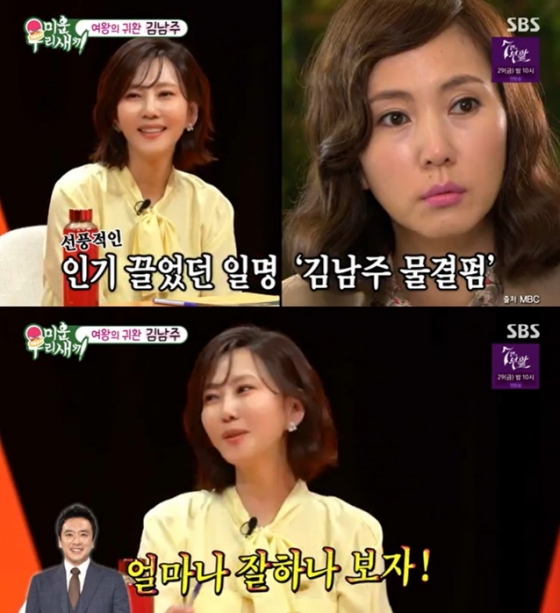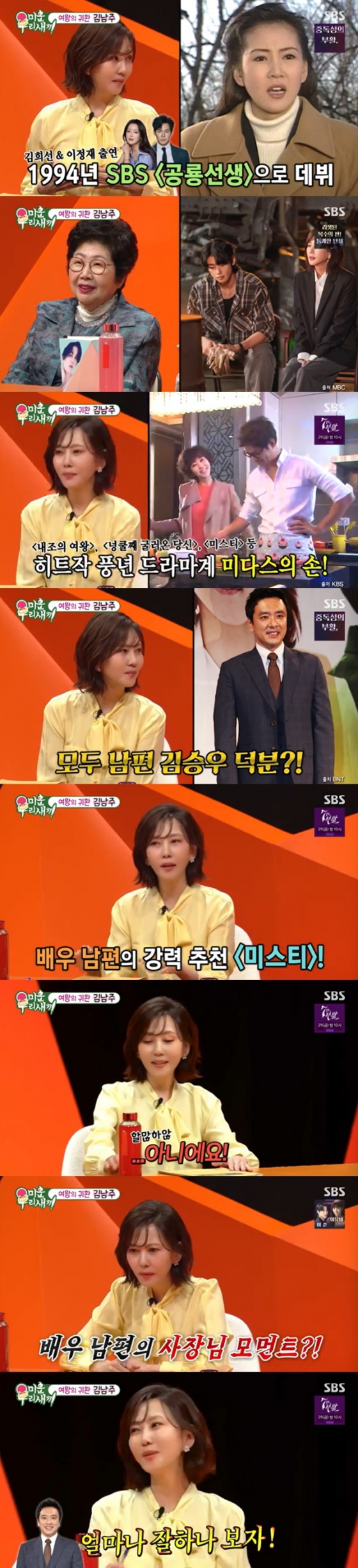 SBS 공채 탤런트 4기 출신인 김남주는 1994년 SBS 드라마 '공룡선생'으로 데뷔한 후 이날 '미우새'로 25년 만에 SBS 방송에 출연했다. 그는 "저는 SBS가 낳은 딸인데 이렇게 오랜만에 온다. 섭섭하다"라고 농담했다.
